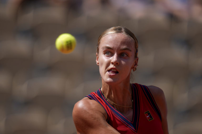 Slovenská tenistka Anna Karolína Schmiedlová počas osemfinálového zápasu dvojhry žien na letnej olympiáde v Paríži, v ktorom zdolala štvorku pavúka Jasmine Paoliniovú 7:5, 3:6, 7:5. Paríž, 30. júl 2024. Foto: SITA/AP.