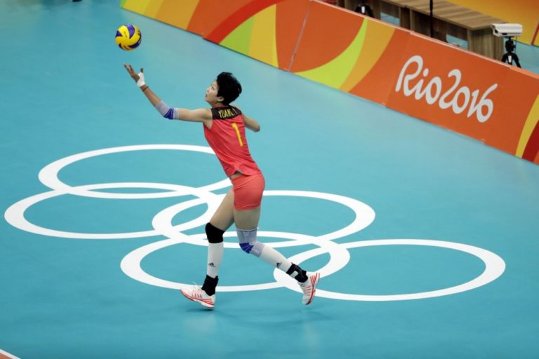 Čínska volejbalistka Yuan Xinyue servuje počas proti Taliankam. Rio de Janeiro, 8. august 2016. Foto: SITA/AP