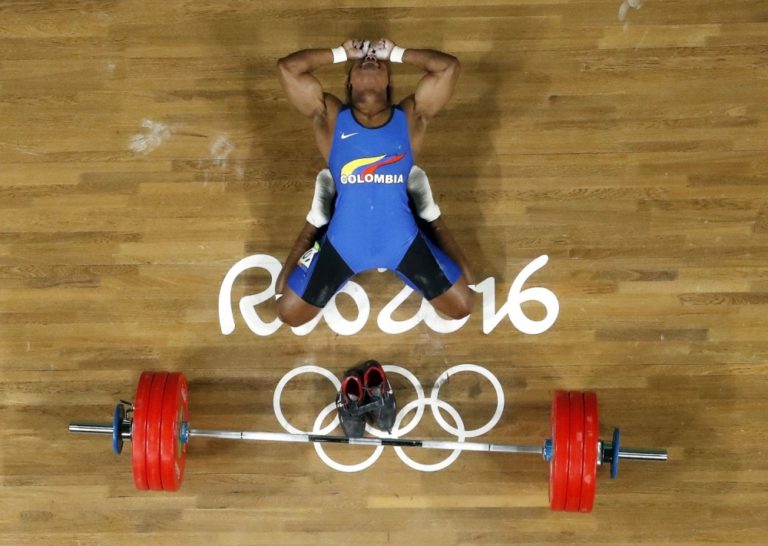 Kolumbijský vzpierač Óscar Figueroa Mosquera sa teší zo zisku zlatej medaily v kategórii do 62 kg. Rio de Janeiro, 8. august 2016. Foto: SITA/AP