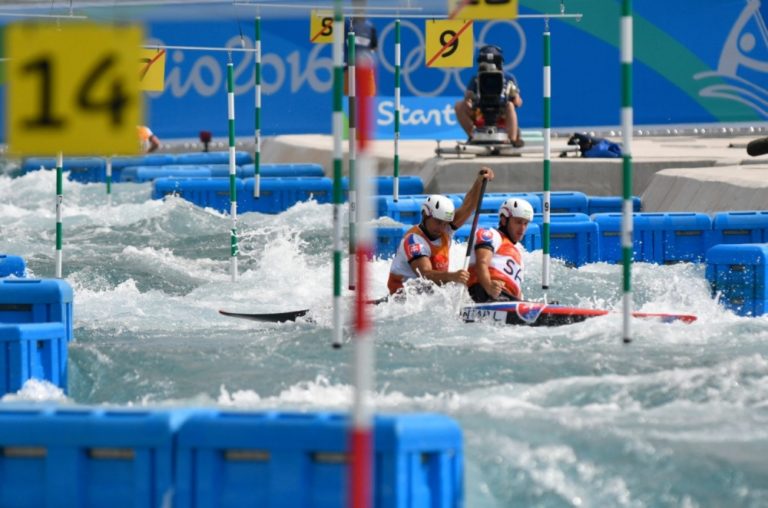 Slovenskí deblkanoisti Ladislav Škantár a Peter Škantár počas kvalifikácie disciplíny C2. Rio de Janeiro, 8. august 2016. Foto: SITA/Martin Medňanský