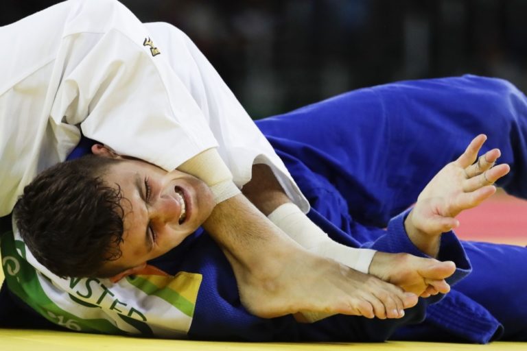 Austrálsky džudista Jake Bensted v súboji s Rustamom Orujovom z Azerbajdžanu počas zápasu v kategórii do 73 kg. Rio de Janeiro, 8. august 2016. Foto: SITA/AP