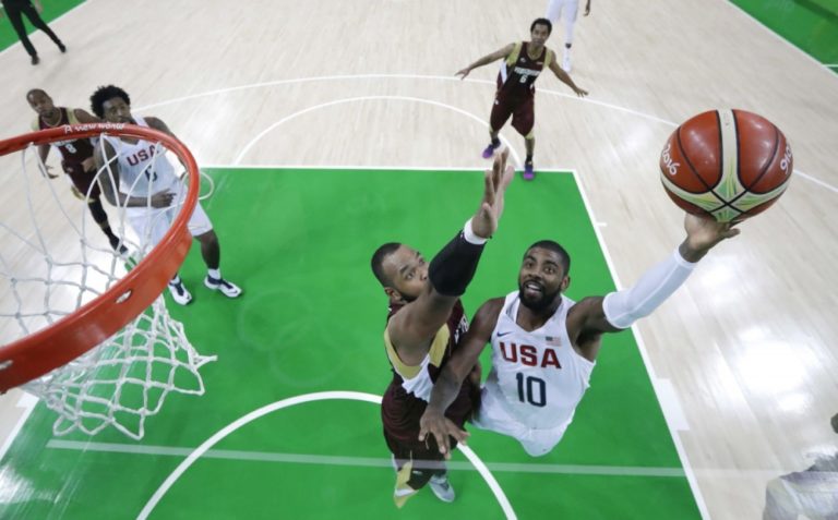 Venezuelský basketbalista Gregory Echenique bráni Američana Kyrieho Irwinga. Rio de Janeiro, 8. august 2016. Foto: SITA/AP