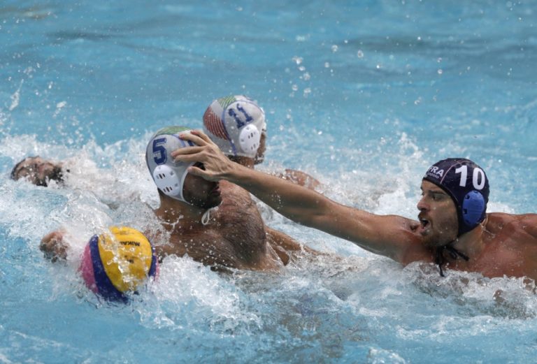 Súboj francúzskeho vodného pólistu s Talianmi Andreom Fondellim (vľavo) a Mathieuom Peissonom. Rio de Janeiro, 8. august 2016. Foto: SITA/AP