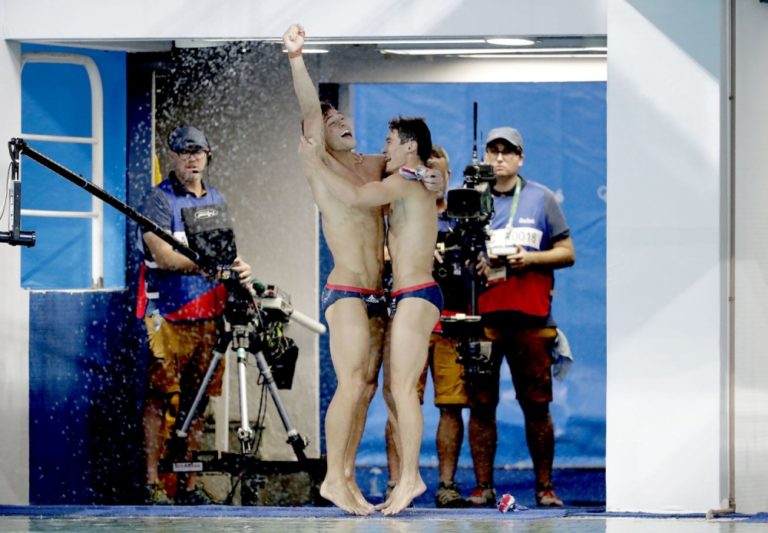 Reprezentanti Veľkej Británie Tom Daley (vľavo) a Daniel Goodfellow sa radujú zo zisku bronzových medailí v synchrónnych skokoch do vody z 10 m veže. Rio de Janeiro, 8. august 2016. Foto: SITA/AP