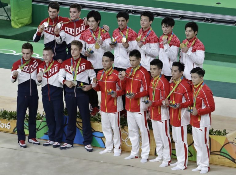 Športoví gymnasti Japonska Rjohei Kato, Kenzo Širai, Jusuke Tanaka, Kohei Učimura, Kodži Jamamuro si vybojovali zlaté medaily v súťaži družstiev mužov. Striebro putuje do Ruska zásluhou štvorice Denis Abľazin, David Beľavskij, Ivan Stretovič, Nikolaj Kuksenkov, Nikita Nagornyj a bronz do Číny (Teng Šu-ti, Lin Čchao-pchan, Liou Jang, Jou Chao, Čang Čcheng-lung). Rio de Janeiro, 8. august 2016. Foto: SITA/AP