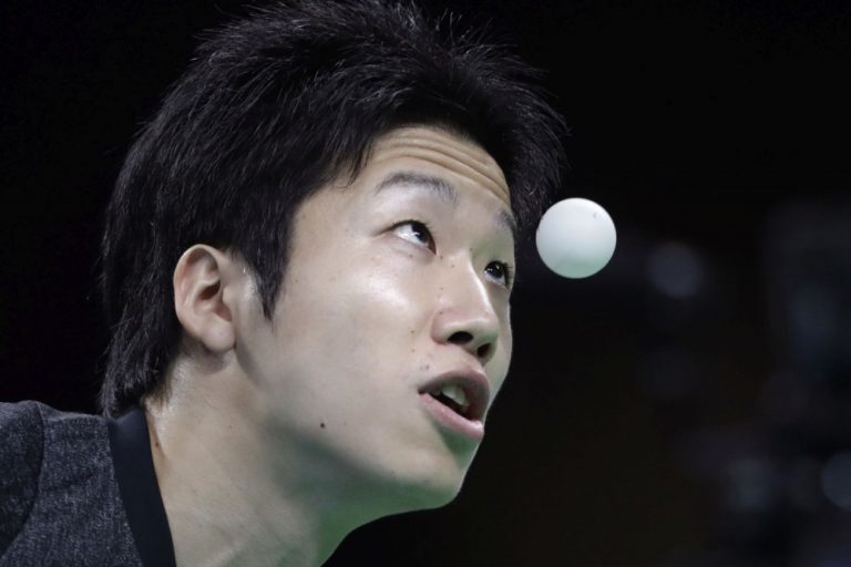 Japonský stolný tenista Jun Mizutani v zápase proti domácemu Brazílčanovi Hugovi Calderanovi. Rio de Janeiro, 8. august 2016. Foto: SITA/AP