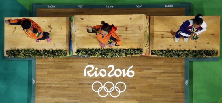 Zľava: Medailistky zo súťaže vzpieračiek do 58 kg - strieborná Pimsiri Sirikaewová (Thajsko), zlatá Sukanya Srisuratová (Thajsko) a bronzová Kchuo Hsing-čchun (Taiwan). Rio de Janeiro, 8. august 2016. Foto: SITA/AP