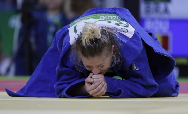 Rumunská džudistka Corina Caprioriuová plače po finálovom zápase kategórie do 57 kg, v ktorom podľahla domácej reprezentantke Mariane Silvovej. Rio de Janeiro, 8. august 2016. Foto: SITA/AP