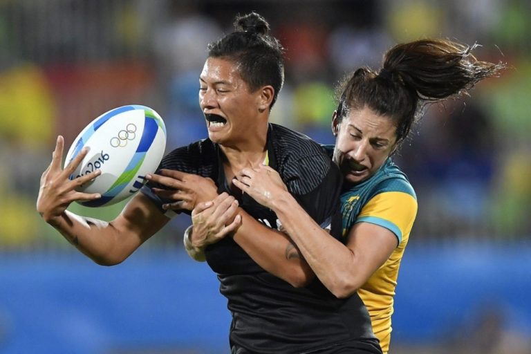 Novozélandská ragbistka Gayle Broughtonová (vľavo) v súboji s Austrálčankou Aliciou Quirkovou počas finálového zápasu. Rio de Janeiro, 8. august 2016. Foto: Zsolt Czegledi/MTI via AP