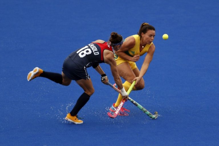 Americká pozemná hokejistka Michelle Kasoldová v súboji s Austrálčankou Georgie Parkerovou. Rio de Janeiro, 8. august 2016. Foto: SITA/AP