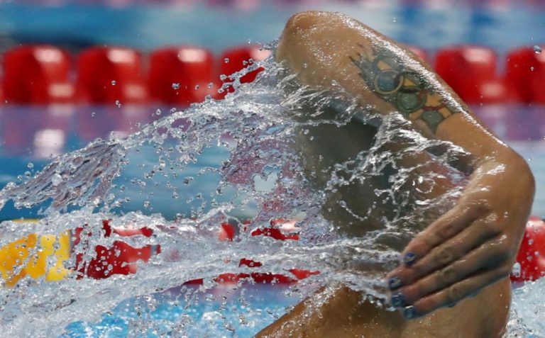 Tetovanie na ruku švédskej plavkyne Sarah Sjöströmovej. Rio de Janiero, 8. august 2016. Foto: SITA/AP