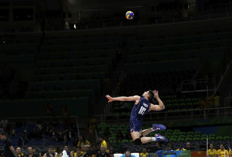 Servis talianskeho volejbalistu Filippa Lanzu počas zápasu proti Francúzsku. Rio de Janeiro, 7. august 2016. Foto: SITA/AP