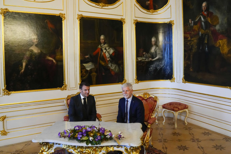 Francúzsky prezident Emmanuel Macron (vľavo) počas rokovania s českým prezidentom Petrom Pavlom na Pražskom hrade. Foto: SITA/AP