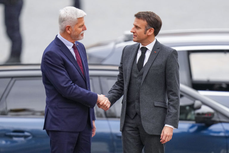 Český prezident Petr Pavel (vľavo) si podáva ruku s francúzskym prezidentom Emmanuelom Macronom. Foto: SITA/AP