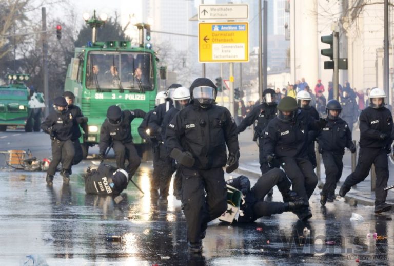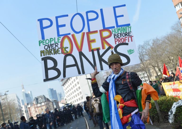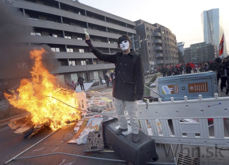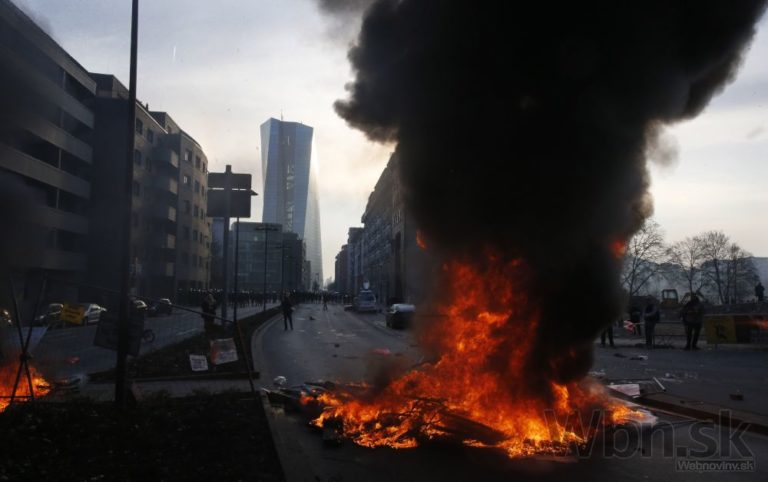Vo Frankfurte sa zhromaždili demonštranti, ktorí protestujú proti politike úsporných opatrení Európskej centrálnej banky, ktoré podľa protestujúcich priviedli mnohých ľudí do chudoby.
