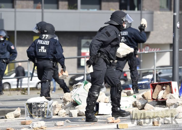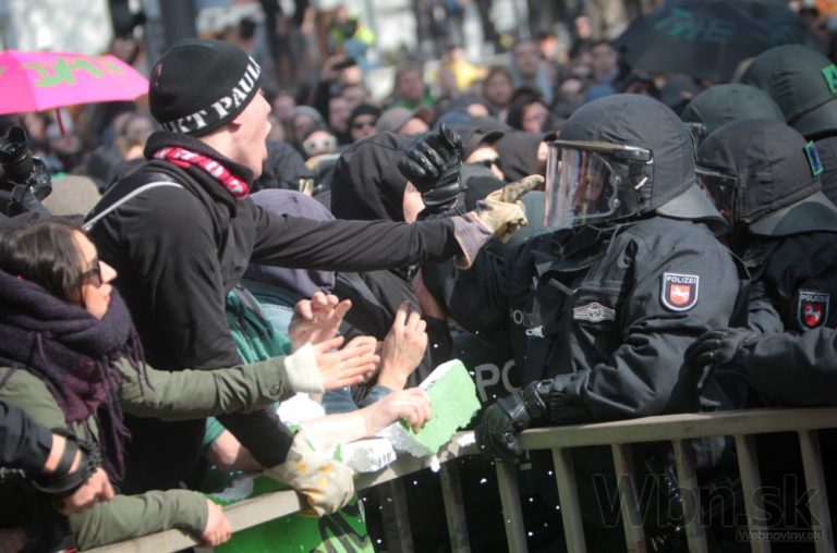 Policajti sa snažia zabrániť prístupu demonštrantov k novopostavenej centrále Európskej centrálnej banky za 1, 3 miliardy eur vo Frankfurte. (Frankfurt, 18.03.2015) Foto: SITA/AP