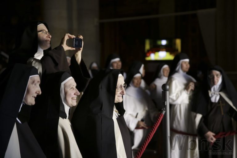 Mníšky sa pozerajú na modliaceho sa pápeža Františka I., ktorý si na niekoľko minút sadol pred Turínske plátno. Foto: SITA/AP