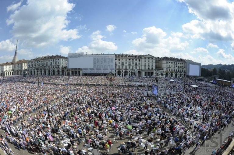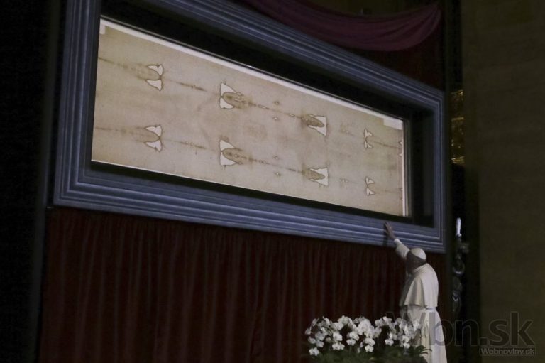 Pápež František I. sa modlí v miestnej katedrále pred Turínskym plátnom, ktoré je tu mimoriadne vystavené od 19. apríla do 24. júna. Foto: SITA/AP