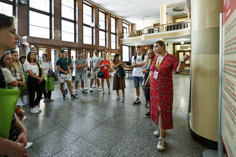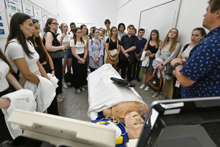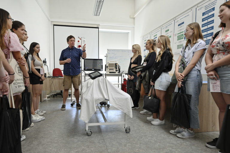 Starší medici zo študentských spolkov sprevádzajú nováčikov v simulačnom centre počas Fresher´s day na Lekárskej fakulte Univerzity Komenského (LF UK) v Bratislave. Bratislava 11. september 2023. Foto: SITA/Milan Illík