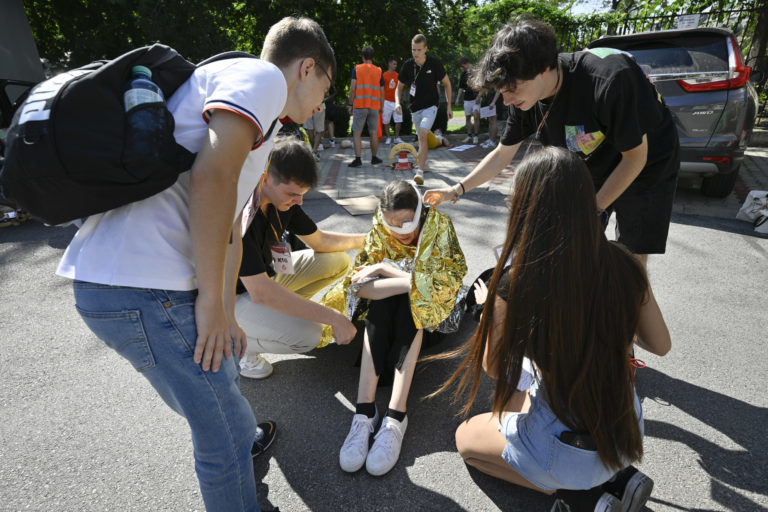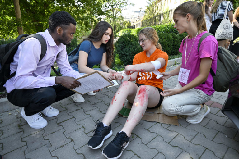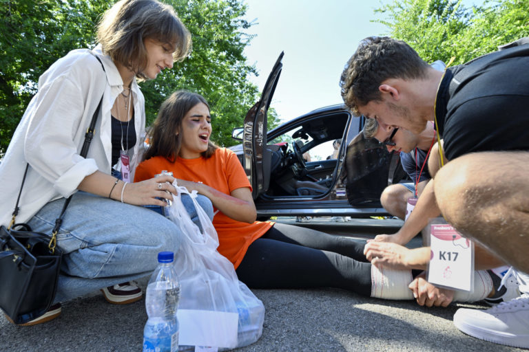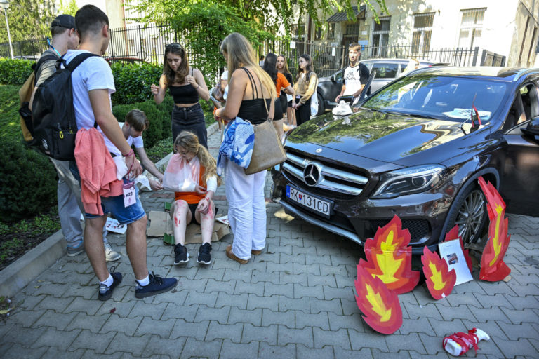 Starší medici zo študentských spolkov simulujú rôzne typy zranení, ktoré môžu počas autonehody nastať a prváci si skúšajú ošetrovanie zranených počas Fresher´s day na Lekárskej fakulte Univerzity Komenského (LF UK) v Bratislave. Bratislava 11. september 2023. Foto: SITA/Milan Illík
