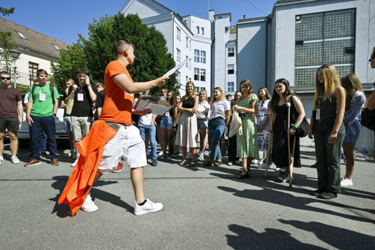 Starší medici zo študentských spolkov sprevádzajú nováčikov jednotlivými budovami, pracoviskami počas Fresher´s day na Lekárskej fakulte Univerzity Komenského (LF UK) v Bratislave. Bratislava 10. september 2023. Foto: SITA/Milan Illík