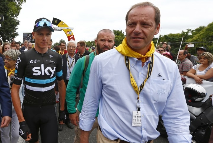 Riaditeľ pretekov Christian Prudhomme (vpravo) a Brit Chris Froome pred 8. etapou Tour de France, ktorá viedla z Pau do Bagnéres-de-Luchon a merala 184 kilometrov. Foto: SITA/AP
