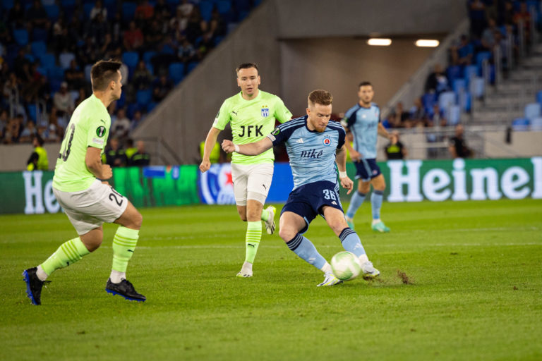 Lucas Lovat z ŠK Slovan Bratislava a Jóannes Danielsen z KÍ Klaksvík počas zápasu A-skupiny Európskej konferenčnej ligy 2023/2024. Bratislava, 21. september 2023. Foto: SITA/Jana Birošová.