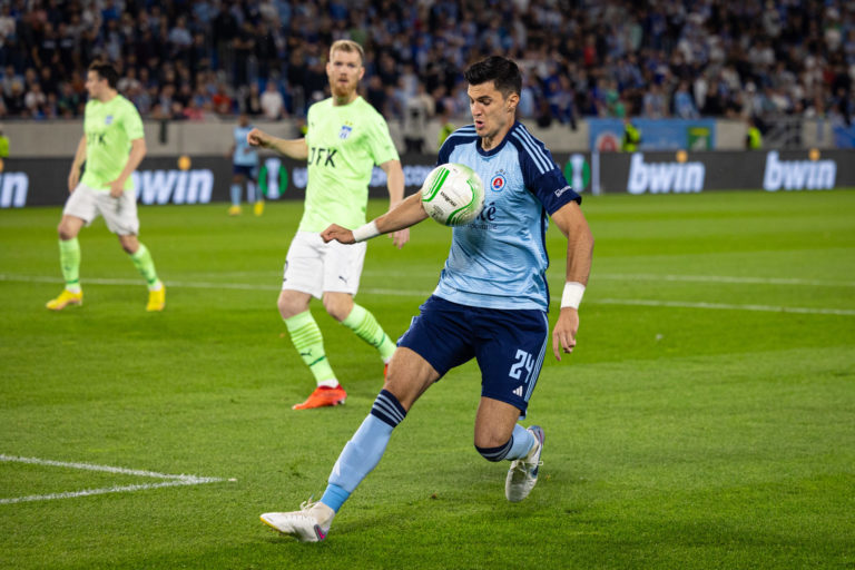Marko Tolić z ŠK Slovan Bratislava si spracováva loptu v zápase proti KÍ Klaksvík v A-skupine Európskej konferenčnej ligy 2023/2024. Bratislava, 21. september 2023. Foto: SITA/Jana Birošová.