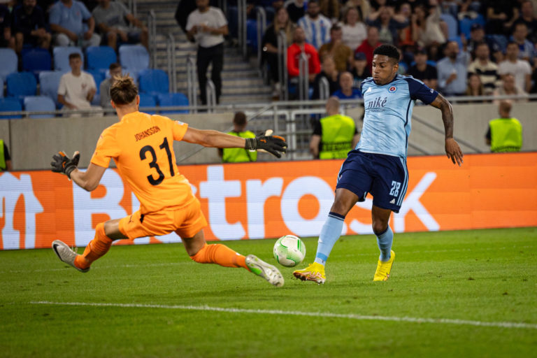 Cesar Blackman z ŠK Slovan Bratislava sa snaží prekonať brankára Nilsa Jonatana Johanssona z KÍ Klaksvík počas zápasu A-skupiny Európskej konferenčnej ligy 2023/2024. Bratislava, 21. september 2023. Foto: SITA/Jana Birošová.