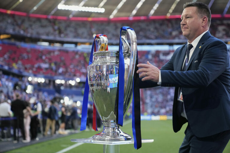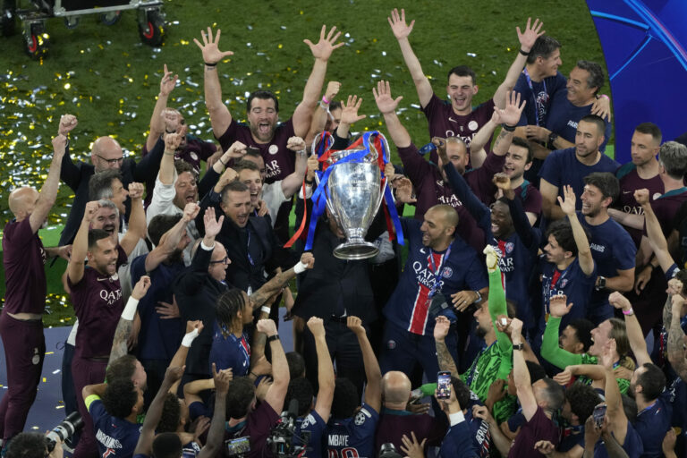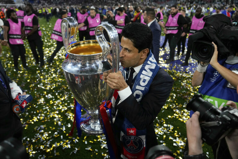 Majiteľ Paríža Saint-Germain Nasser bin Ghanim Al-Khelaifi s trofejou pre víťaza Ligy majstrov po finálovom zápase, v ktorom hráči jeho klubu deklasovali Inter Miláno 5:0. Mníchov (Allianz Arena), 31. máj 2025. Foto: SITA/AP