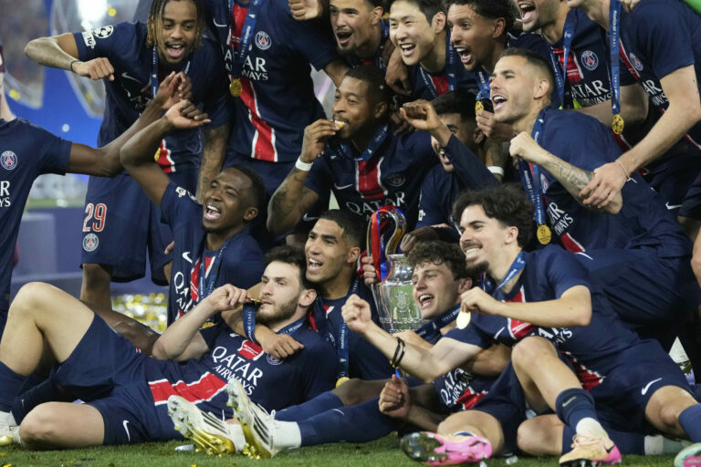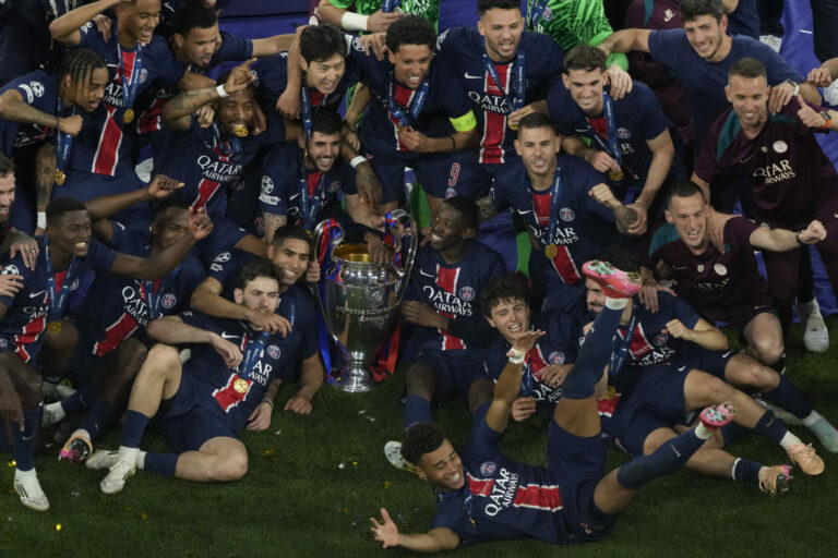 Hráči Paríža St. Germain s trofejou po finálovom zápase Ligy majstrov, v ktorom deklasovali Inter Miláno 5:0. Mníchov (Allianz Arena), 31. máj 2025. Foto: SITA/AP.