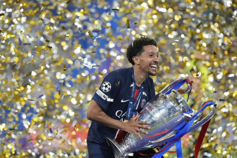Kapitán Marquinhos s víťaznou trofejou po finále Ligy majstrov, v ktorom jeho Paríž St. Germain deklasoval Inter Miláno 5:0. Mníchov (Allianz Arena), 31. máj 2025. Foto: SITA/AP.