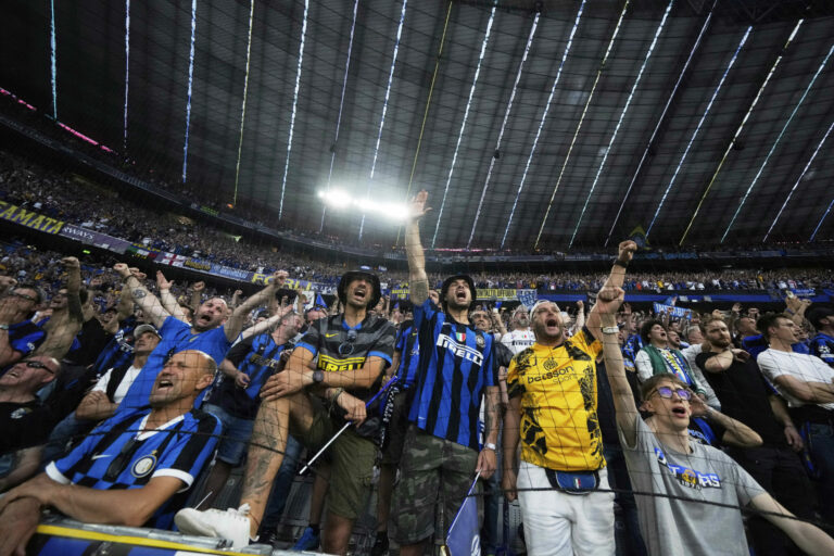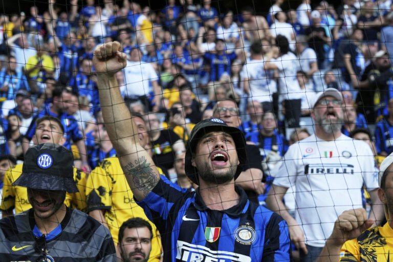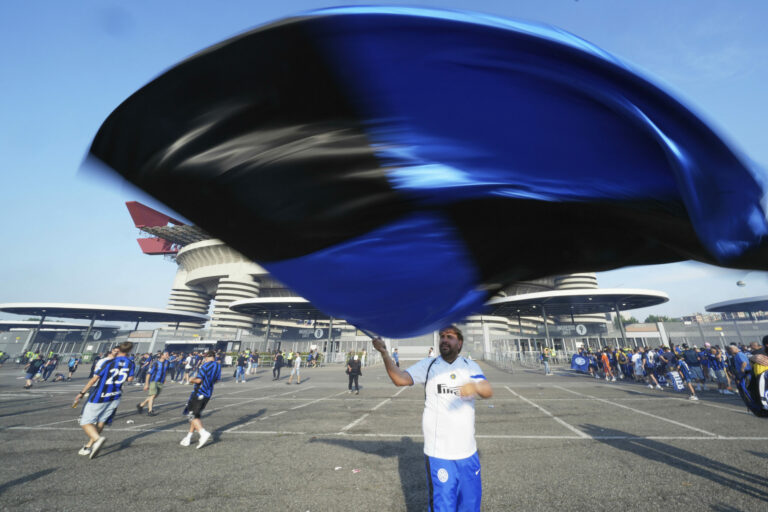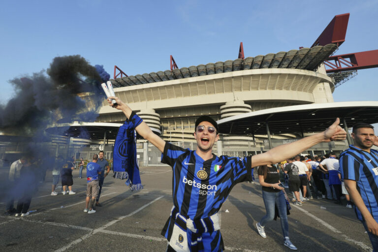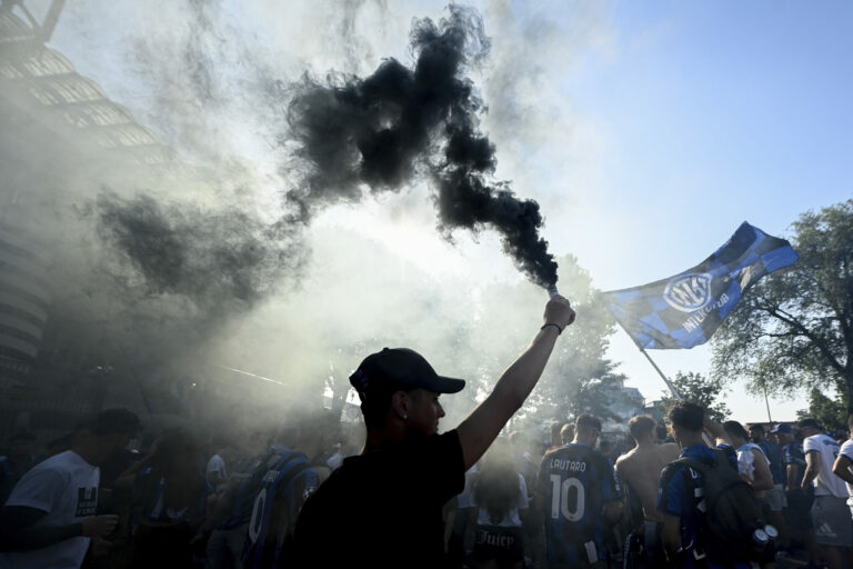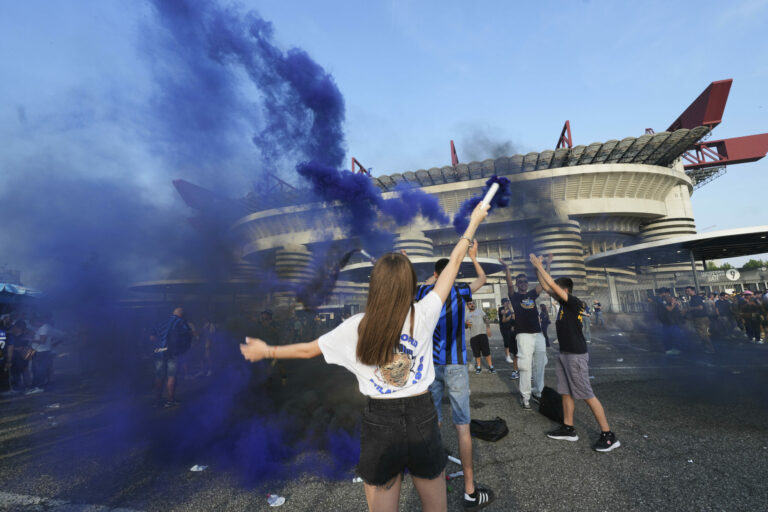 Fanúšikovia Interu Miláno pred štadiónom San Siro pred finálovým zápasom Ligy majstrov. Miláno, 31. máj 2025. Foto: Claudio Furlan/LaPresse via AP