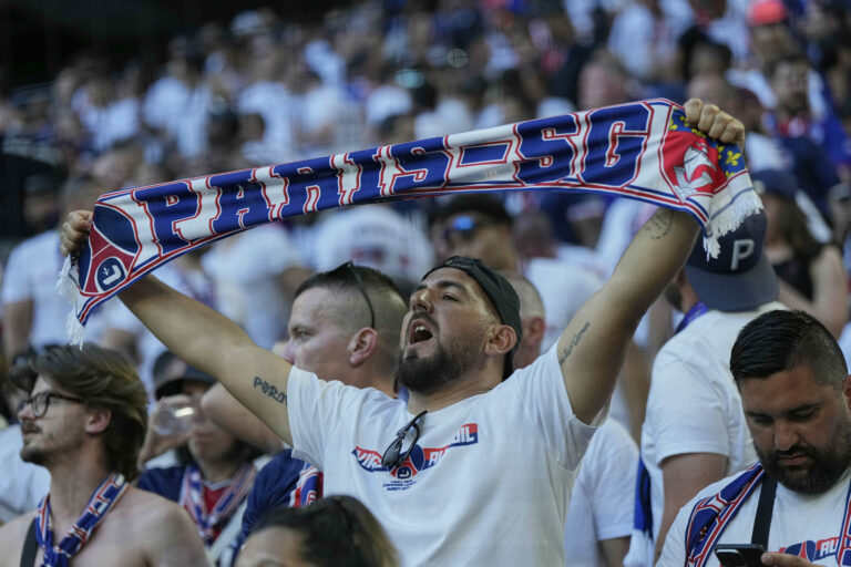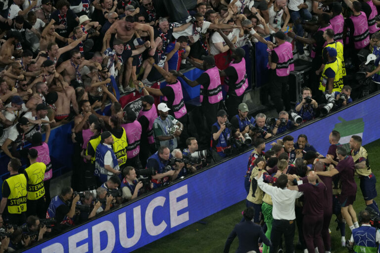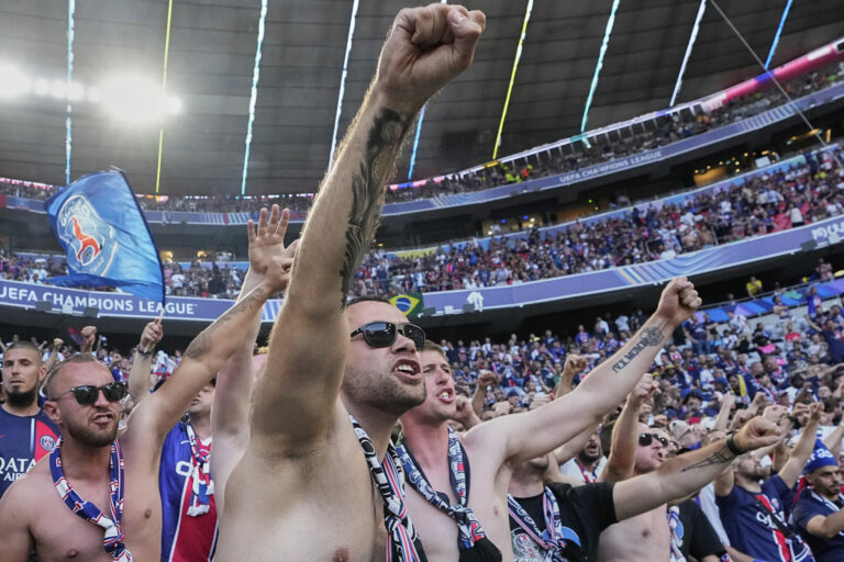Fanúšikovia Paríža St. Germain sa tešia z gólu Achrafa Hakimiho na 1:0 v 12. minúte zápasu proti Interu Miláno vo finále Ligy majstrov 2024/2025. Mníchov (Allianz Arena), 31. máj 2025. Foto: SITA/AP.