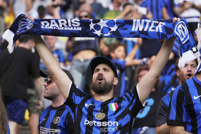 Fanúšikovia Interu Miláno počas finálového zápasu Ligy majstrov 2024/2025, v ktorom ich tím utŕžil debakel 0:5 od Paríža St. Germain. Mníchov (Allianz Arena), 31. máj 2025. Foto: SITA/AP.