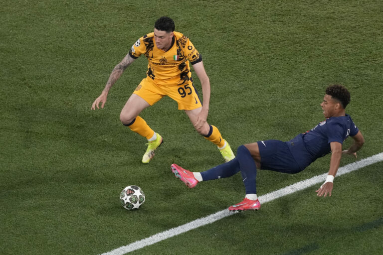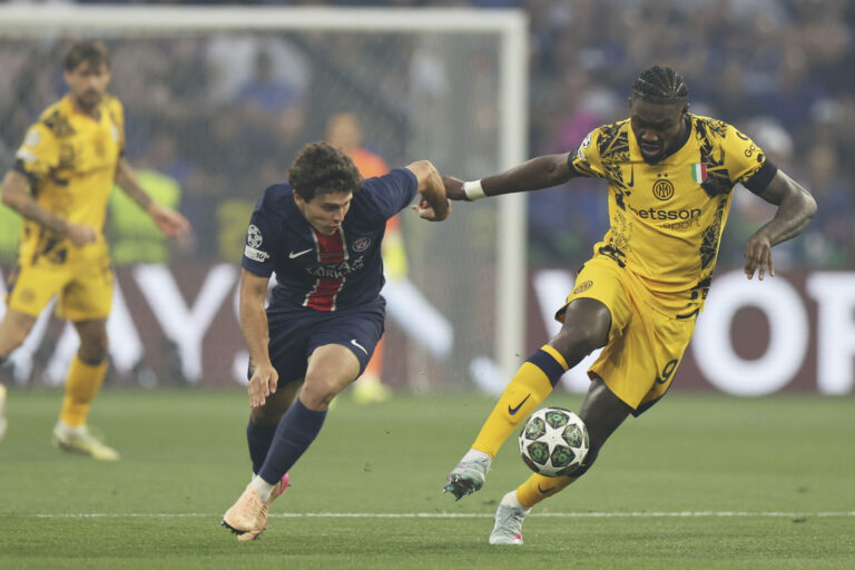 Désiré Doué (PSG) v súboji s Alessandrom Bastonim z Interu Miláno počas finálového zápasu Ligy majstrov 2024/2025. Mníchov (Allianz Arena), 31. máj 2025. Foto: SITA/AP.