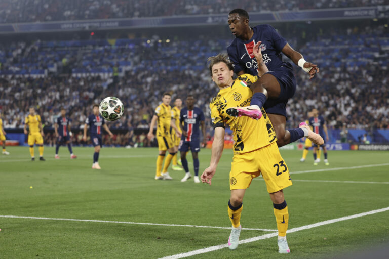 Willian Pacho (PSG) v súboji s Nicolom Barellom počas finálového zápasu Ligy majstrov 2024/2025. Mníchov (Allianz Arena), 31. máj 2025. Foto: SITA/AP.