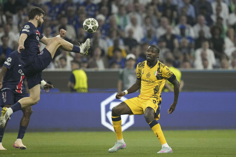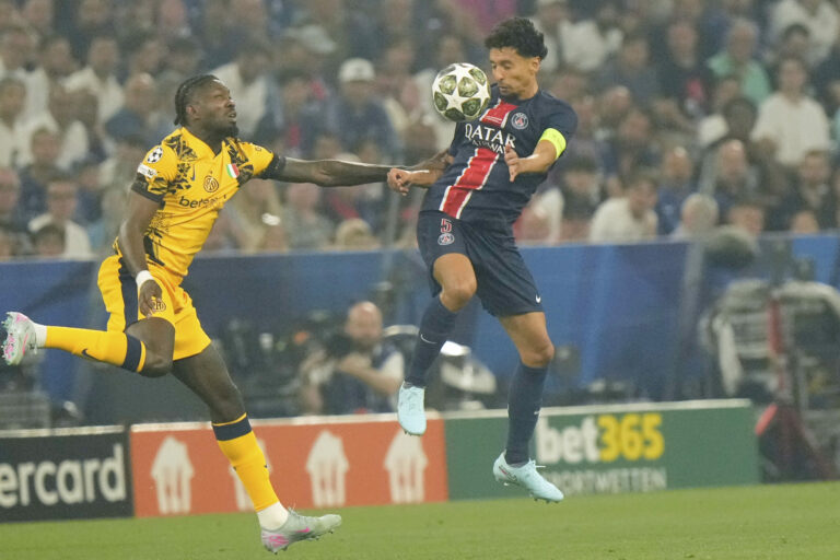 Marcus Thuram z Interu Miláno v súboji s Marquinhosom (PSG) počas finálového zápasu Ligy majstrov 2024/2025. Mníchov (Allianz Arena), 31. máj 2025. Foto: SITA/AP.