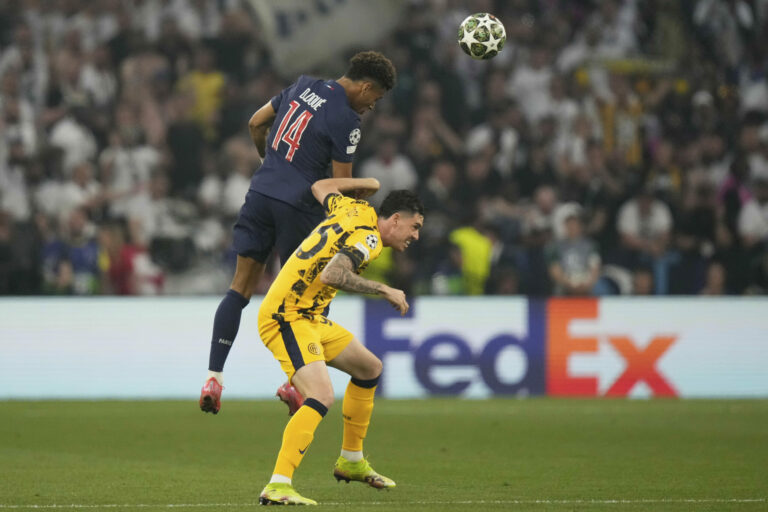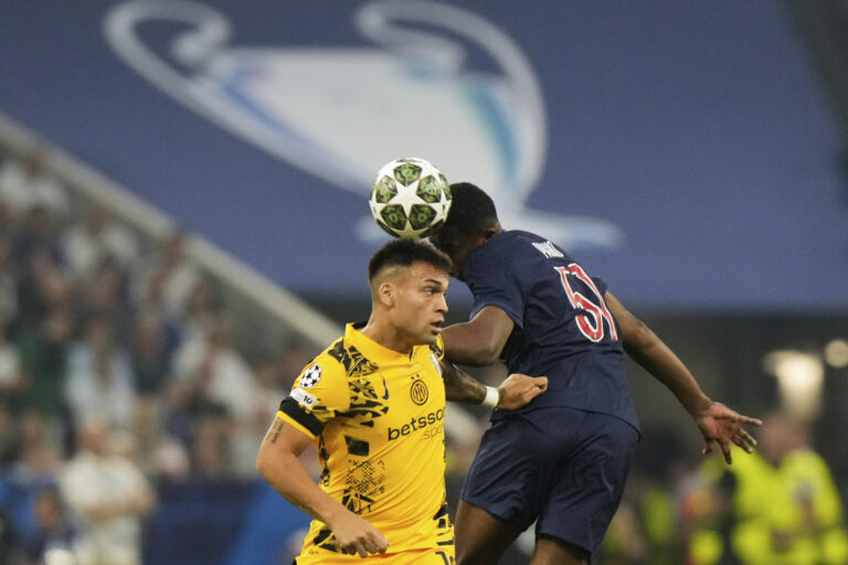 Hlavičkový súboji Lautara Martíneza z Interu Milána s Willianom Pachom počas finálového zápasu Ligy majstrov 2024/2025. Mníchov (Allianz Arena), 31. máj 2025. Foto: SITA/AP.