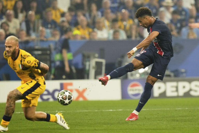 Senny Mayulu strieľa piaty gól Paríža St. Germain v zápase proti Interu Miláno vo finále Ligy majstrov. Mníchov (Allianz Arena), 31. máj 2025: Foto: SITA/AP.