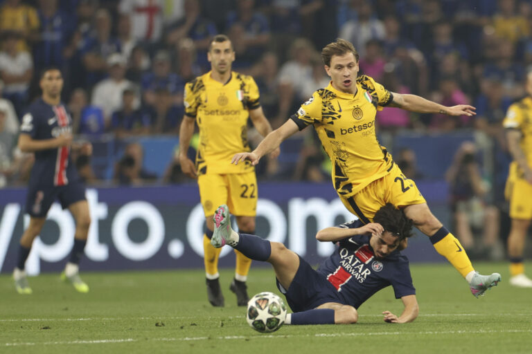 Vitinha (PSG) padá po súboji s Nicolom Barellom z Interu Miláno počas finálového zápasu Ligy majstrov 2024/2025. Mníchov (Allianz Arena), 31. máj 2025. Foto: SITA/AP.