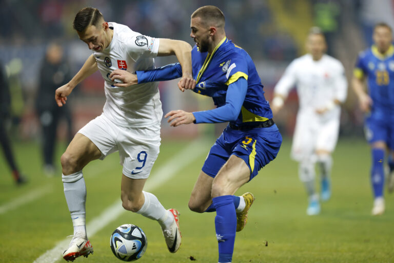 Reprezentant Bosny a Hercegoviny Ivan Basic a Slovák Tomáš Suslov počas zápasu J-skupiny kvalifikácie o postup na Euro 2024. Zenica, 19. november 2023. Foto: SITA/AP.