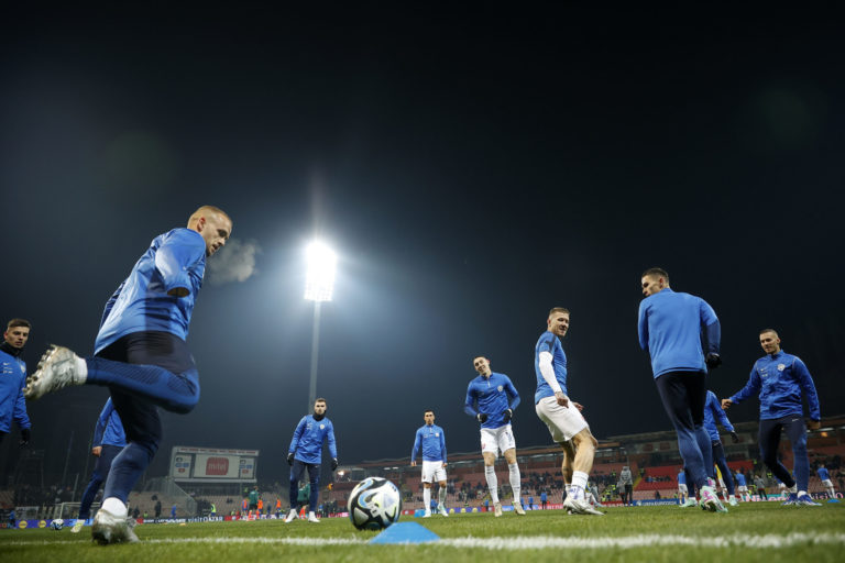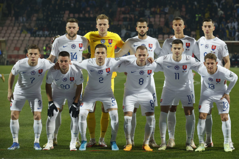 Slovenskí reprezentanti pred zápasom proti Bosne a Hercegovine v J-skupine kvalifikácie o postup na Euro 2024. Zenica, 19. november 2023. Foto: SITA/AP.