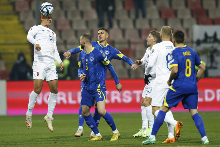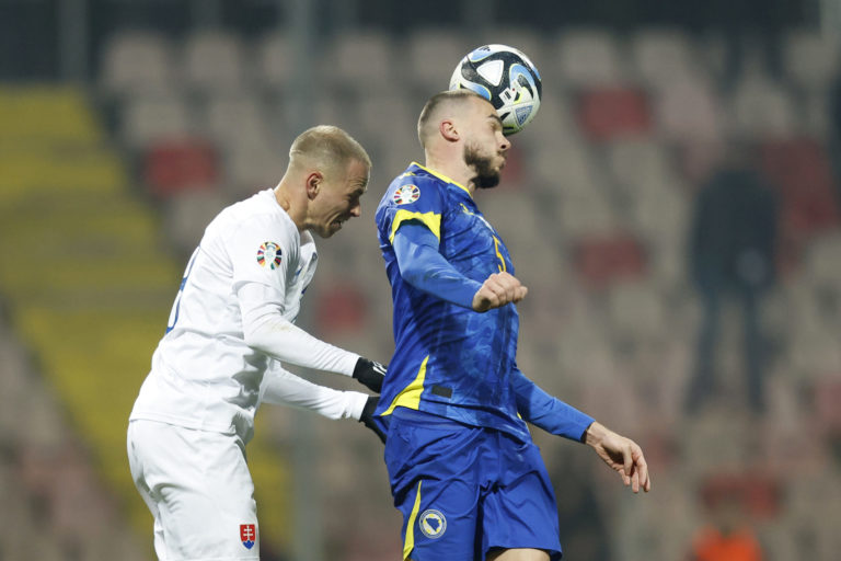 Slovenský reprezentant Ľubomír Šatka hlavičkuje loptu počas zápasu proti Bosne a Hercegovine v J-skupine kvalifikácie o postup na Euro 2024. Zenica, 19. november 2023. Foto: SITA/AP.