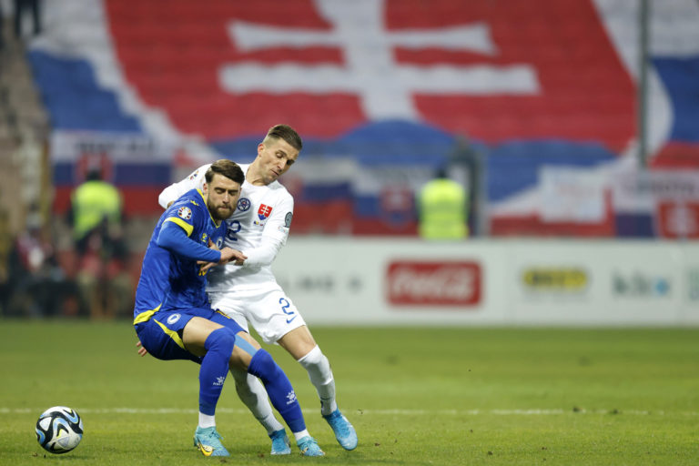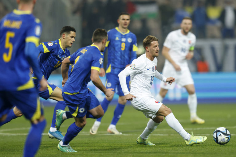 Slovenský reprezentant Patrik Hrošovský prihráva loptu počas zápasu proti Bosne a Hercegovine v J-skupine kvalifikácie o postup na Euro 2024. Zenica, 19. november 2023. Foto: SITA/AP.