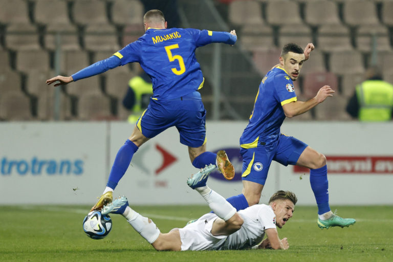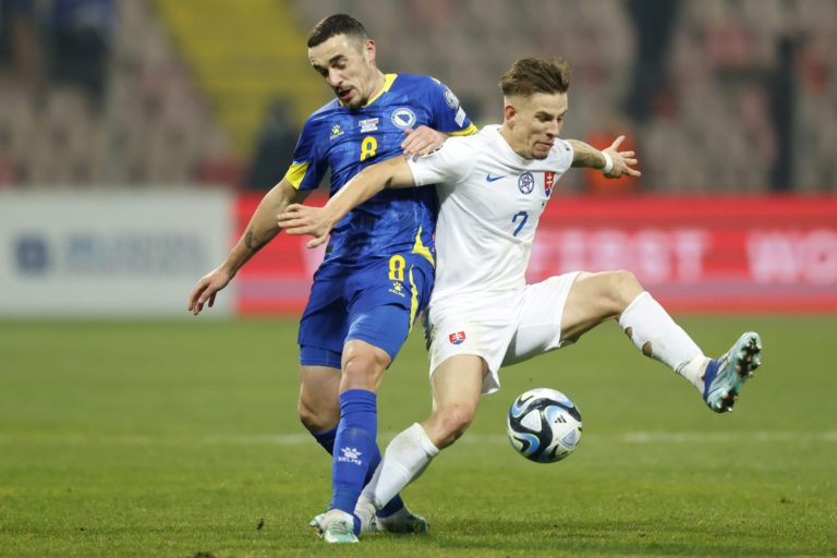 Reprezentant Bosny a Hercegoviny Nihad Mujakic a Slovák Ondrej Duda počas zápasu J-skupiny kvalifikácie o postup na Euro 2024. Zenica, 19. november 2023. Foto: SITA/AP.