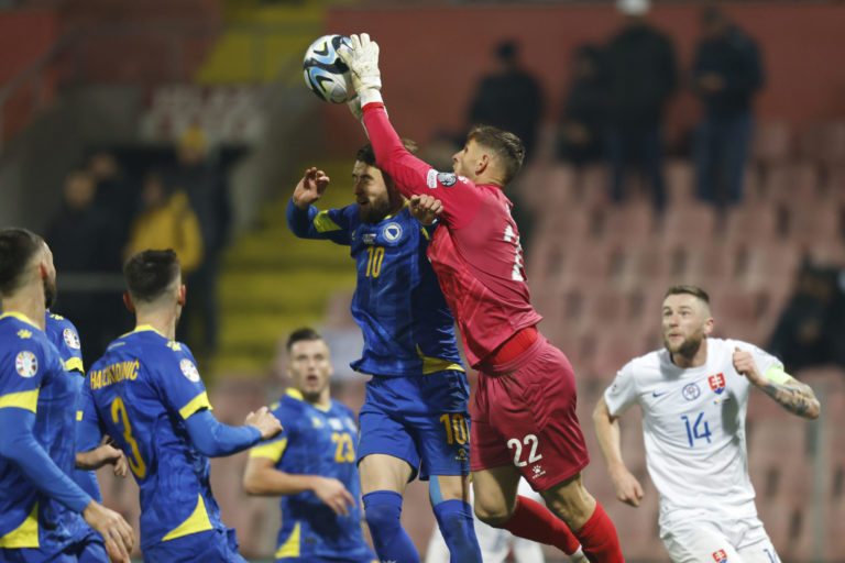 Zákrok brankára Bosny a Hercegoviny Kenana Pirica počas zápasu proti Slovensku v J-skupine kvalifikácie o postup na Euro 2024. Zenica, 19. november 2023. Foto: SITA/AP.