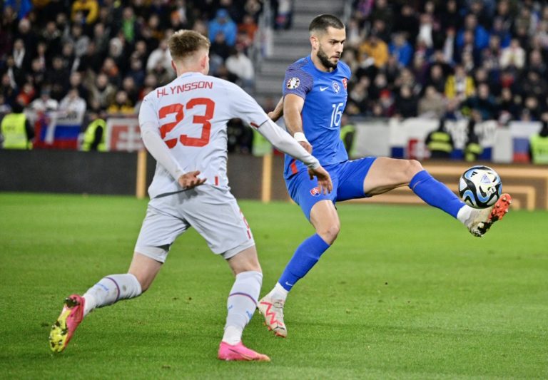 Slovenský reprezentant Dávid Hancko a Islanďan Kristian Hlynsson počas zápasu J-skupiny kvalifikácie o postup na Euro 2024. Bratislava, 16. november 2023. Foto: SITA/Milan Illík.