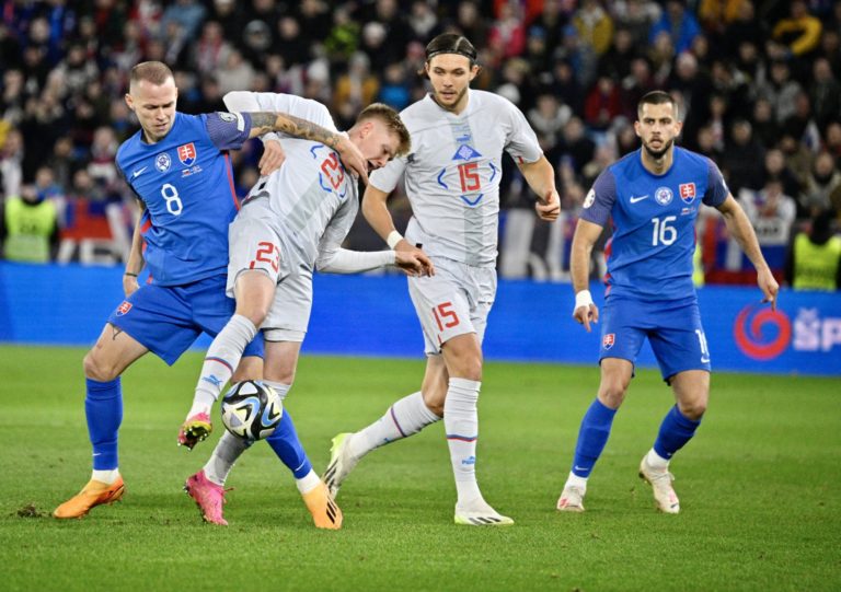 Slovenský reprezentant Ondrej Duda v súboji s Islanďanom Kristianom Hlynssonom počas zápasu J-skupiny kvalifikácie o postup na Euro 2024. Bratislava, 16. november 2023. Foto: SITA/Milan Illík.