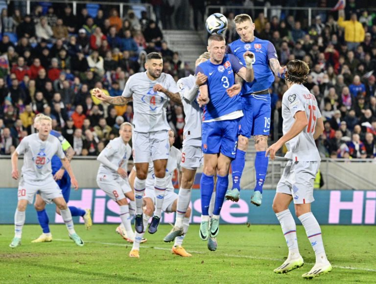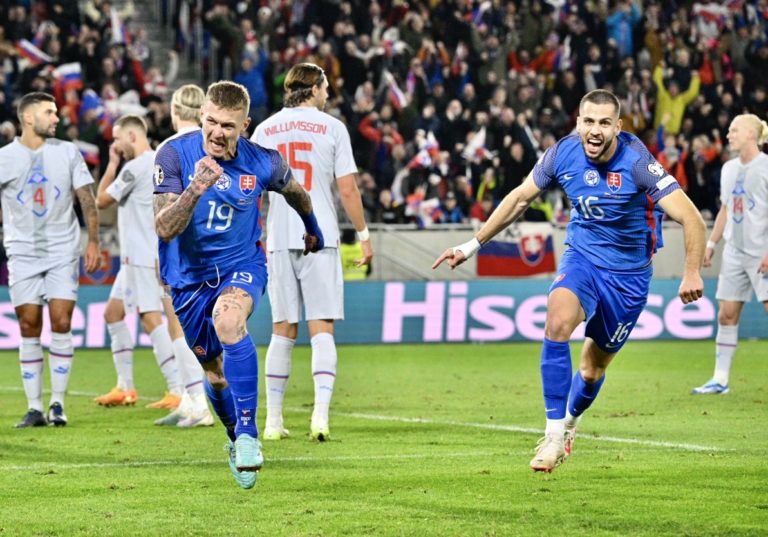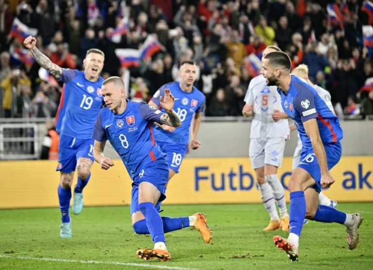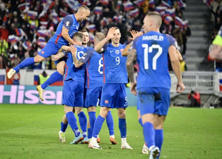 Slovenskí futbalisti po góle Juraja Kucku na 1:1 v zápase proti Islandu v J-skupine kvalifikácie o postup na Euro 2024. Bratislava, 16. november 2023. Foto: SITA/Milan Illík.